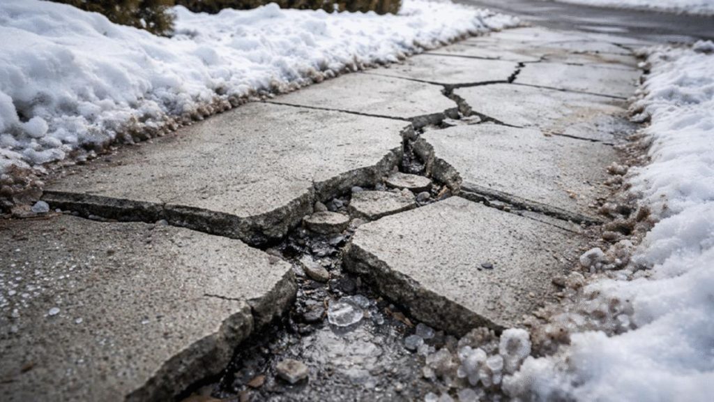 După iarnă, betonul din curte este expus unor cicluri repetate de îngheț-dezgheț. Apa pătrunde în pori, îngheață și își mărește volumul, ceea ce duce la tensiuni interne și, în timp, la apariția fisurilor. Fenomenul este frecvent în zonele neprotejate sau unde drenajul apei nu este eficient, iar problema se agravează dacă betonul nu a fost corect turnat inițial sau nu a fost protejat cu un strat hidroizolant.