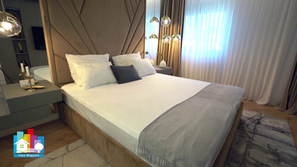 Dormitorul, în această amenajare contemporană de lux, este gândit ca un spațiu de relaxare cu impact vizual puternic