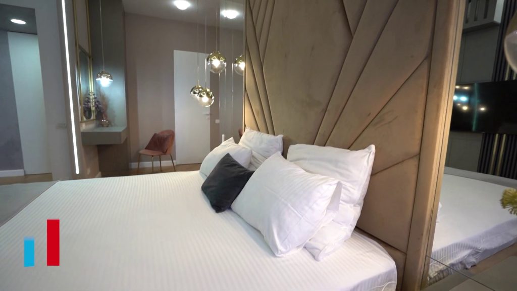 Dormitorul, în această amenajare contemporană de lux, este gândit ca un spațiu de relaxare cu impact vizual puternic. Patul tapițat, cu detalii geometrice elegante, devine elementul principal al încăperii. Deși suprafața este limitată, senzația de spațiu este amplificată prin folosirea oglinzilor pe întreaga lățime a peretelui lateral.