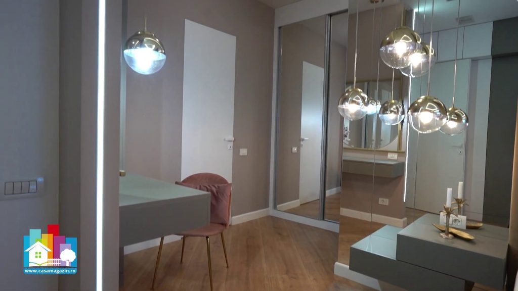 Placarea pereților cu oglinzi nu este doar o soluție estetică, ci și una practică. Această alegere creează impresia unei camere mai mari și reflectă lumina naturală, oferind dormitorului mai multă adâncime și un aer aerisit, fără a pierde nimic din nota predominantă de luxury.