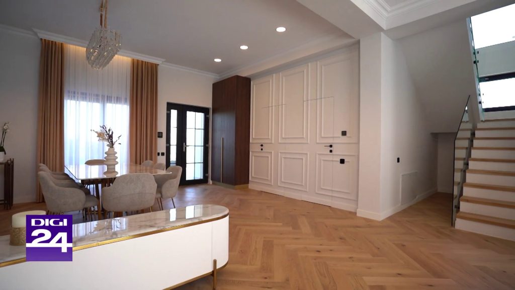 Etajul casei este dedicat zonei de noapte și include patru dormitoare. Fiecare spațiu păstrează aceeași linie neoclasic contemporană, cu palete cromatice calme și detalii decorative bine controlate.