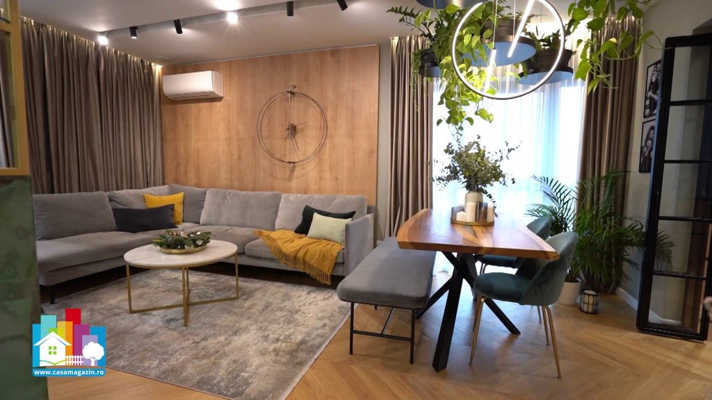 În acest proiect, designerul de interior Mihaela Tampiza a pus accent pe individualitate. Camera copilului include elemente inspirate din pasiuni, iar mobilierul este adaptat nevoilor reale. În dormitorul matrimonial, peretele de accent și combinația de texturi creează un ambient echilibrat, fără să aglomereze vizual. Băile continuă linia cromatică prin accente turcoaz și iluminat atent ales. Oglinzile și finisajele lucioase măresc vizual spațiul. Întregul proiect arată cum culoarea, folosită corect, poate transforma o locuință fără intervenții complicate sau costuri exagerate.