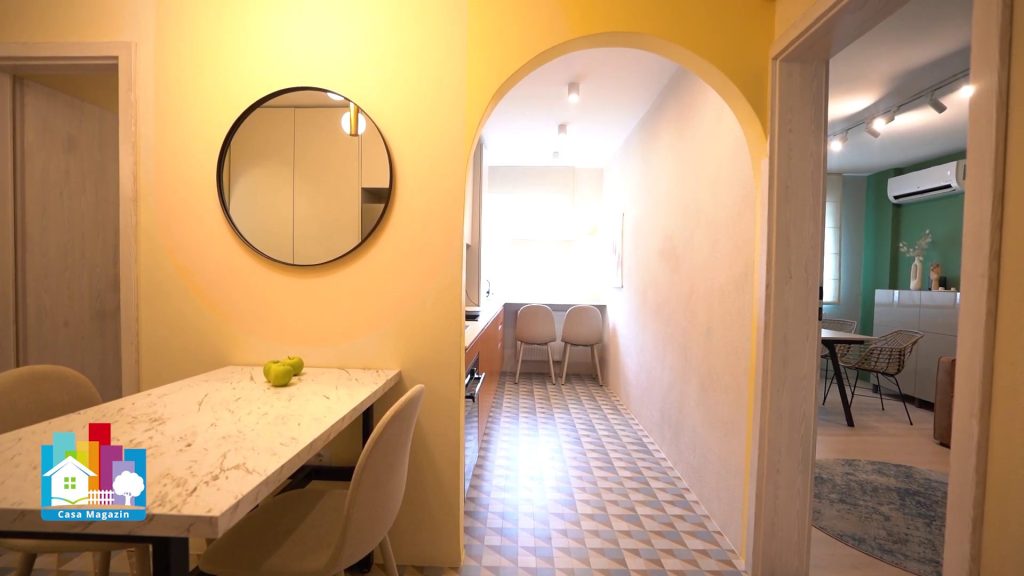Culorile joacă un rol esențial în acest proiect semnat de arhitectul de interior Mihaela Cetenaș. Nuanțele pastelate, precum verdele deschis, galbenul muștar sau rozul pal, sunt combinate cu tonuri mai profunde, specifice stilului Art Deco. Contrastul rezultat este energizant, dar nu obositor.