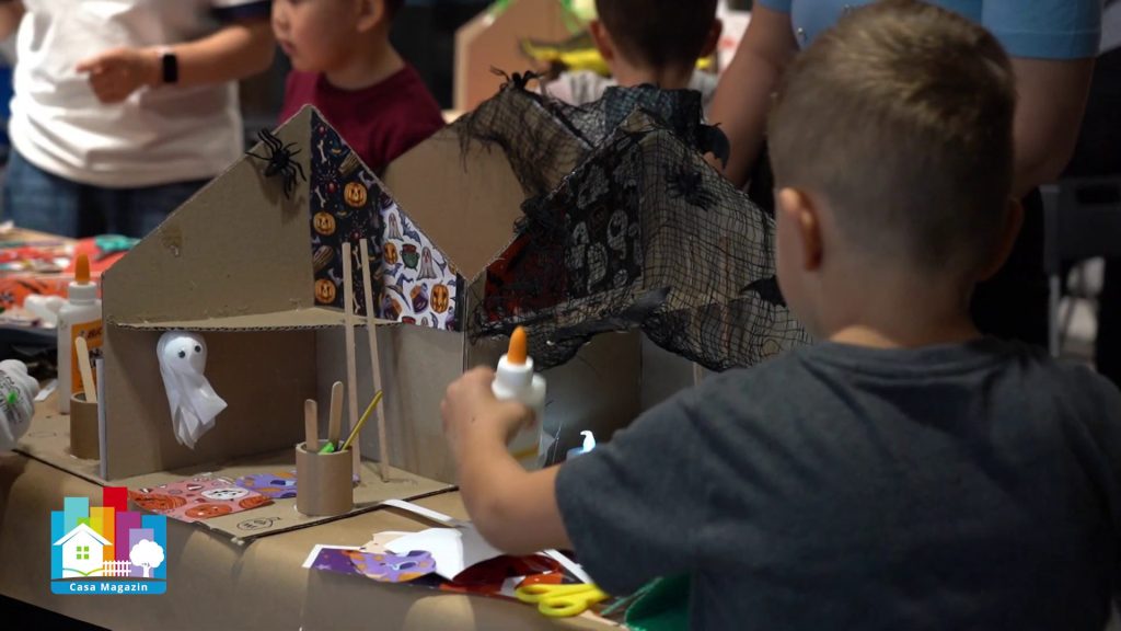 La un atelier recent, dedicat Halloweenului, copiii au construit case „bântuite”, fiecare cu povești, funcțiuni și personaje inventate. Unii au desenat covoare magice și camere secrete, alții au gândit etaje cu marmură sau bucătării suspendate.