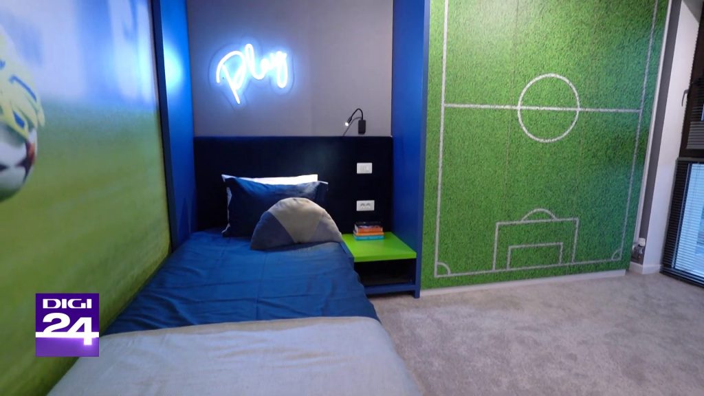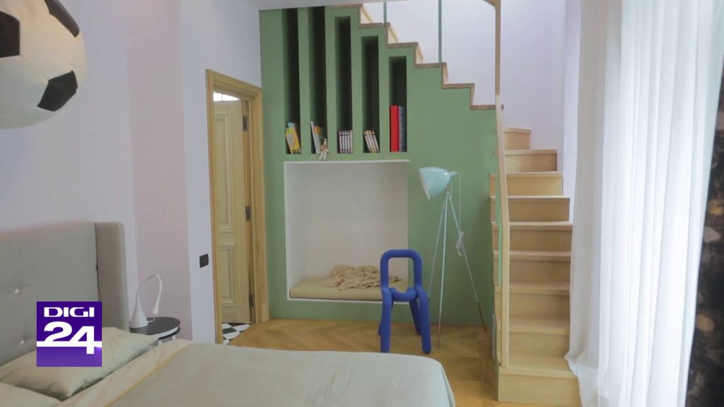 Personalizarea camerei este o modalitate excelentă de a-l face pe cel mic să se simtă „acasă” în propriul univers. Designerul Mihaela Miso, de exemplu, a transformat o cameră banală într-un teren de fotbal în miniatură pentru un mic pasionat de sport. Biroul în formă de poartă, dulapul cu imprimeu de gazon și textul motivațional luminos au dat camerei energia unui stadion, inspirând copilul să viseze și să performeze.