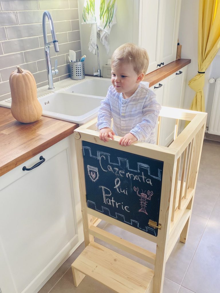 Daca are acces în bucătărie, printr-un turn de învățare sau înălțător va participa, va învăța și va prinde încredere.
