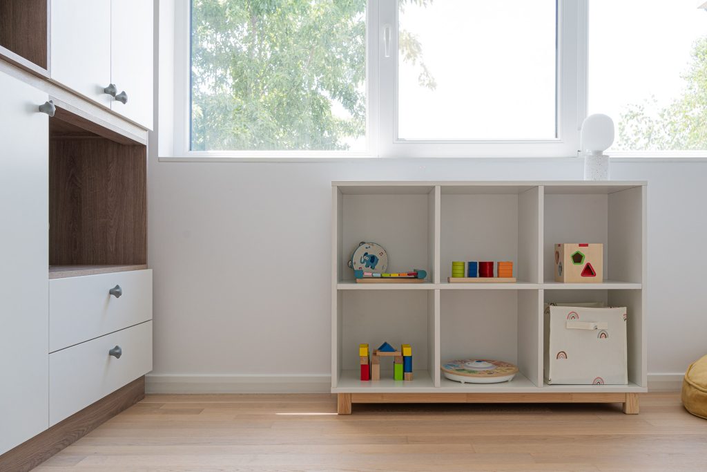Dacă etajera de activități este pe jos, organizată pe categorii clare, la vedere, nu la grămadă, copilul va lua singur jucăriile și le va putea pune la loc odată ce a terminat joaca cu ele.