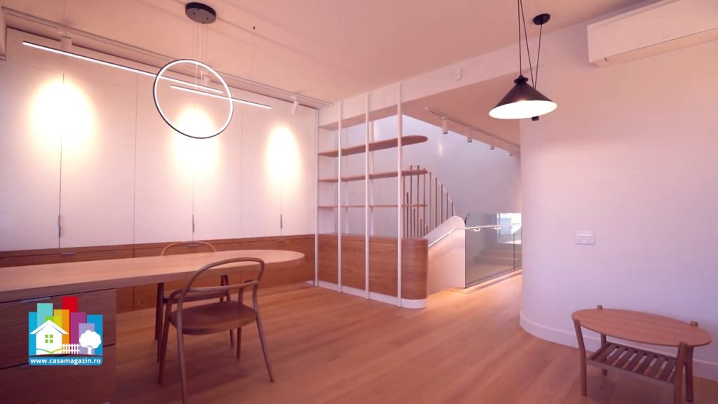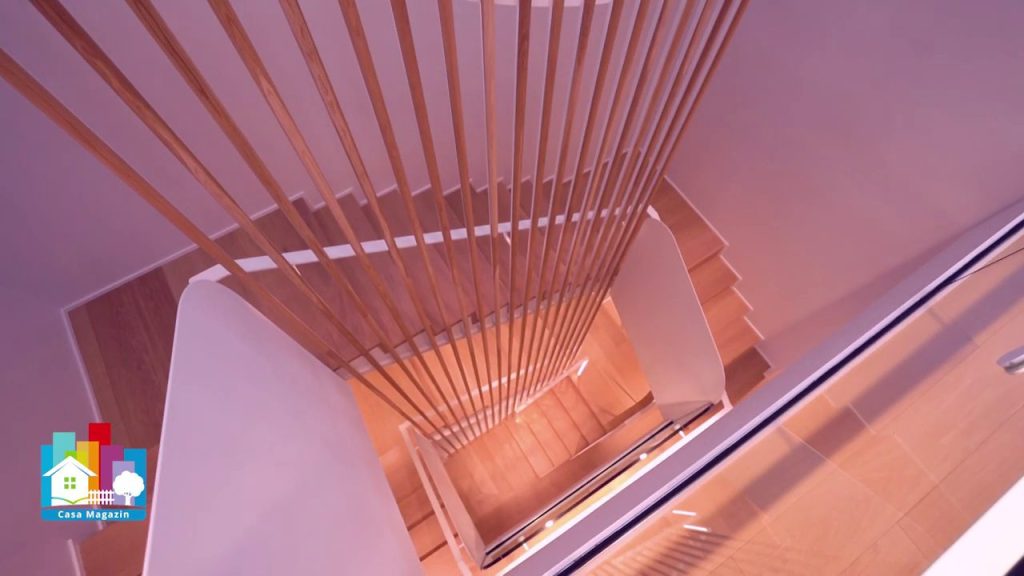 Capătul superior al scării creează un efect optic prin întreruperea controlată a riflajelor. Jocul dintre suprafețele bidimensionale și tridimensionale adaugă profunzime și încheie coerent traseul vertical al casei. Proiectul, coordonat de arhitectul Mihail Neagu, demonstrează cum formele curbe pot deveni element funcțional, nu doar decorativ.