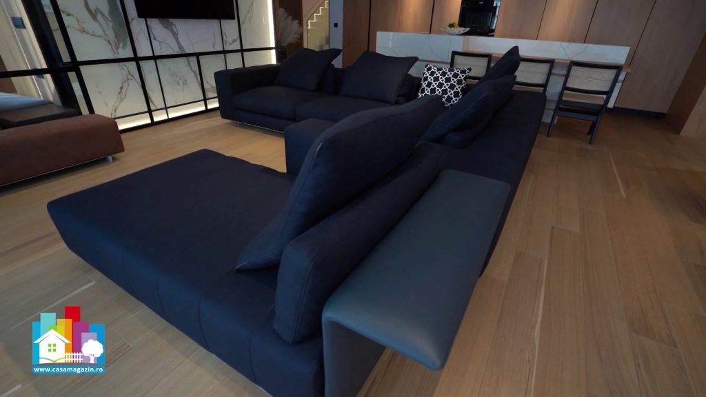 Apartamentul mizează pe un mix atent dozat de materiale: piatră marmorată în plăci de mari dimensiuni, lemn natural, inserții metalice negre și accente aurii discrete. Textilele naturale, precum lâna și inul, adaugă căldură și echilibrează suprafețele dure. Acest contrast controlat este una dintre semnăturile stilului promovat de Șerban Georgescu, arhitectul care, recent, și-a trecut în palmares titlul de Best Office Interior Design in the World, dobândit în Anglia. Despre această din urmă realizare a arhitectului vom vorbi, însă, pe îndelete, într-una din emisiunile viitoare Casa Magazin.