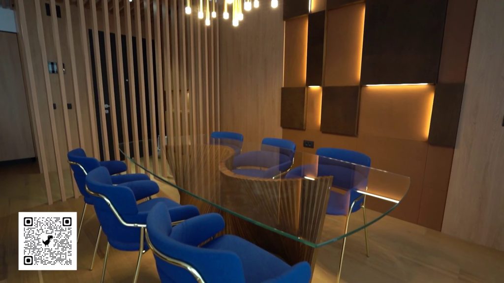 Zona de dining este pusă în valoare de un perete placat cu piele naturală, iluminat ambiental. Masa, cu picior sculptural din lemn, devine un punct focal al încăperii. Detaliile sunt atent alese pentru a crea un spațiu elegant, dar confortabil, potrivit atât meselor zilnice, cât și momentelor speciale.