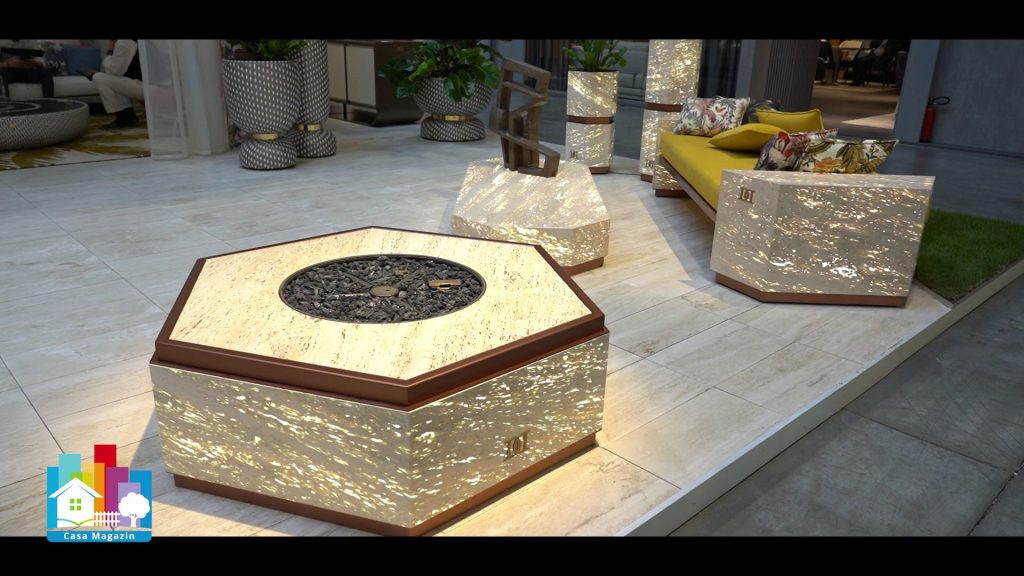 O caracteristică importantă a noilor colecții este integrarea iluminatului ambiental direct în structura pieselor din travertin. Acest detaliu permite folosirea mobilierului atât ziua, cât și seara, indiferent de sezon, fără compromisuri estetice.