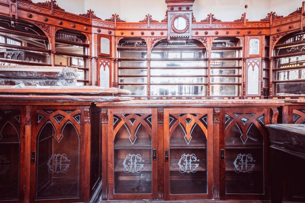 Restaurare Casa Hotăranu. Interiorul păstrează o atmosferă aproape intactă a epocii: vitrine de cristal, marmură de Carrara, mobilier realizat la Viena, un laborator unde medicamente magistrale erau preparate manual.