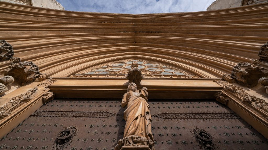Portalul principal ilustrează perfect această evoluție asimetrică. Scena Judecății de Apoi, sculptată cu un realism psihologic tulburător pentru secolul al XIV-lea, susține o rozetă uriașă cu un diametru de 11 metri. Lucrările la acest ansamblu de fațadă s-au oprit brusc în 1348. Izbucnirea Ciumei Negre a decimat populația Europei, inclusiv breslele de pietrari catalani, lăsând partea superioară a catedralei neterminată. Zidăria oprită în plin elan estetic funcționează ca o amprentă vizibilă a colapsului demografic medieval.