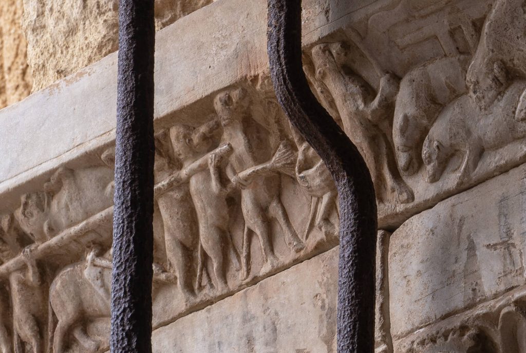 Pe capitelurile coloanelor geminate apar scene de o ironie mușcătoare, cea mai dezbătută fiind „Înmormântarea motanului de către șoareci”. Scena prezintă un cortegiu funerar format din rozătoare care poartă cu solemnitate corpul unui prădător aparent mort. Detaliul antropologic crucial constă în ochiul întredeschis al motanului, pregătit să atace. Cercetătorii identifică în această fabulă litică o satiră aspră la adresa jocurilor de putere. Într-o societate strict ierarhizată, meșterii pietrari au lăsat un avertisment codificat despre ipocrizia elitelor, corupția administrativă și pericolul subestimării inamicului.
