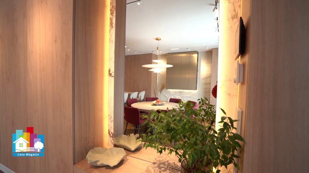 Placajele ceramice cu venaturi accentuate și iluminarea cu LED sunt folosite pentru a transforma o zonă strict funcțională într-una cu impact vizual. Abordarea propusă de MiSo Architects, arată cum un hol poate deveni un spațiu de tranziție bine integrat, nu doar o zonă de trecere.