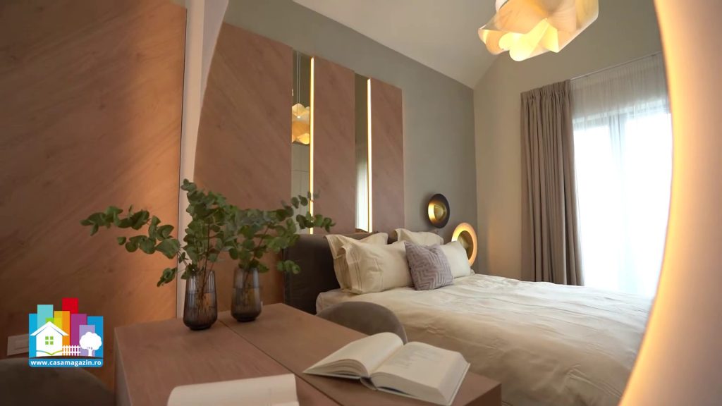 Dormitorul de oaspeți beneficiază de lumină naturală din abundență, iar utilizarea oglinzilor și a iluminării indirecte contribuie la senzația de spațiu aerisit.