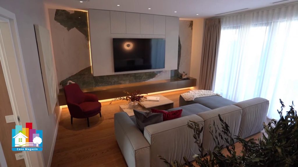 Zona de zi este amplasată la etajul unu și este gândită ca un spațiu calm, orientat spre relaxare. Deși suprafața nu este generoasă, volumul este amplificat de scara interioară și de deschiderea către terasă. Placajele ceramice cu nuanțe inspirate din natură contribuie la atmosfera echilibrată, iar texturile sunt folosite pentru a crea continuitate între elemente.